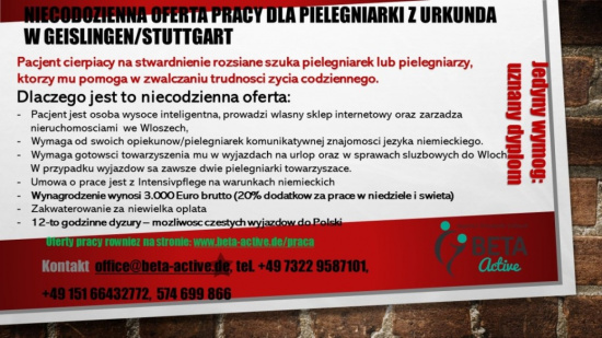 Niecodzienna oferta pracy dla pielęgniarki z Urkundą w Geislingen/Stuttgart.