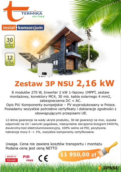 TERMIKA ECO LINE zajmuje się projektowaniem, montażem oraz sprzedażą systemów fotowoltaicznych.Nasza oferta obejmuje pełny zestaw montażowy(panele PV, inwenter, zabezpieczenia AC i DC,kabel solarny, konektor MC4). Producent 3P NSU Naszych paneli jako jedyny udziela 30 lat gwarancji przy